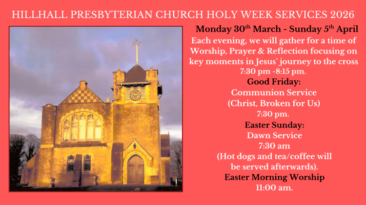 Our aim is that Hillhall Presbyterian Church and the organisations within, become an assembly of God’s people who meet to worship God – Father, Son and Holy Spirit, who live by the standards of God’s word, and who have a concern for the lost and the needy with a burning desire to reach out to the community with the message of God’s redeeming love in Christ, in the power of the Holy Spirit.